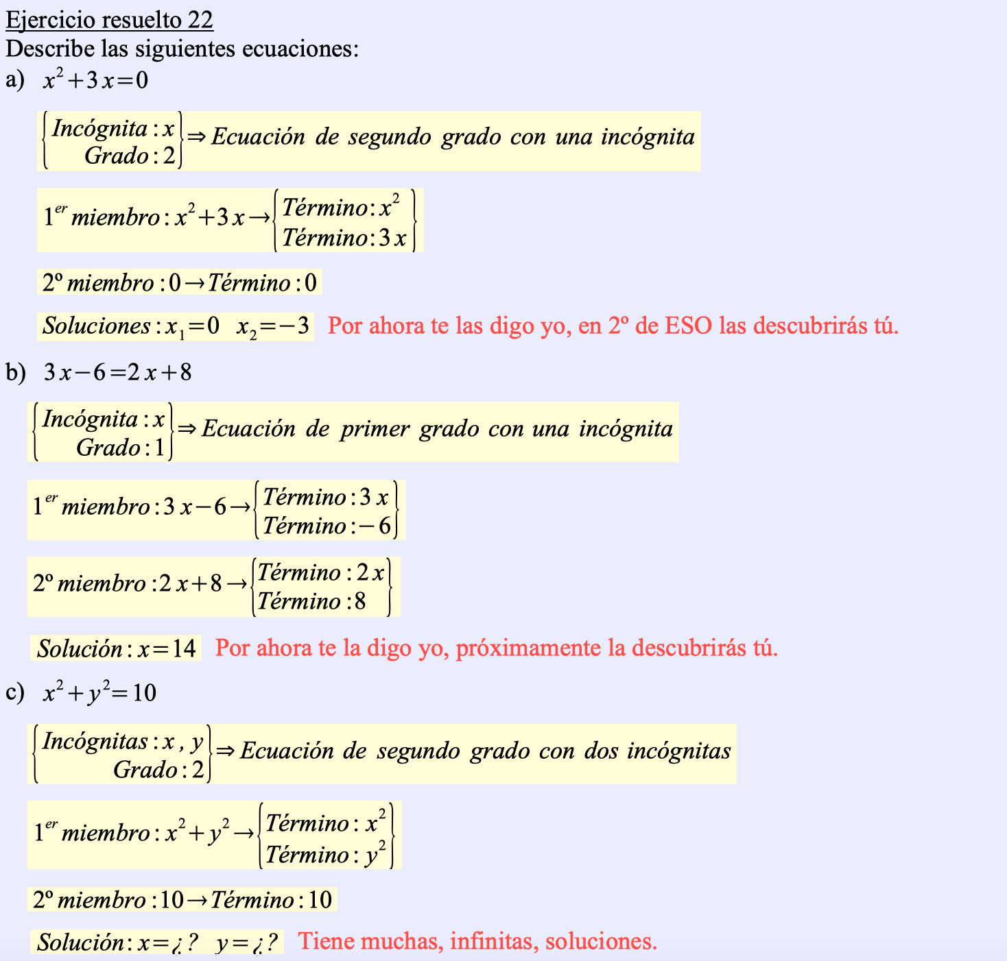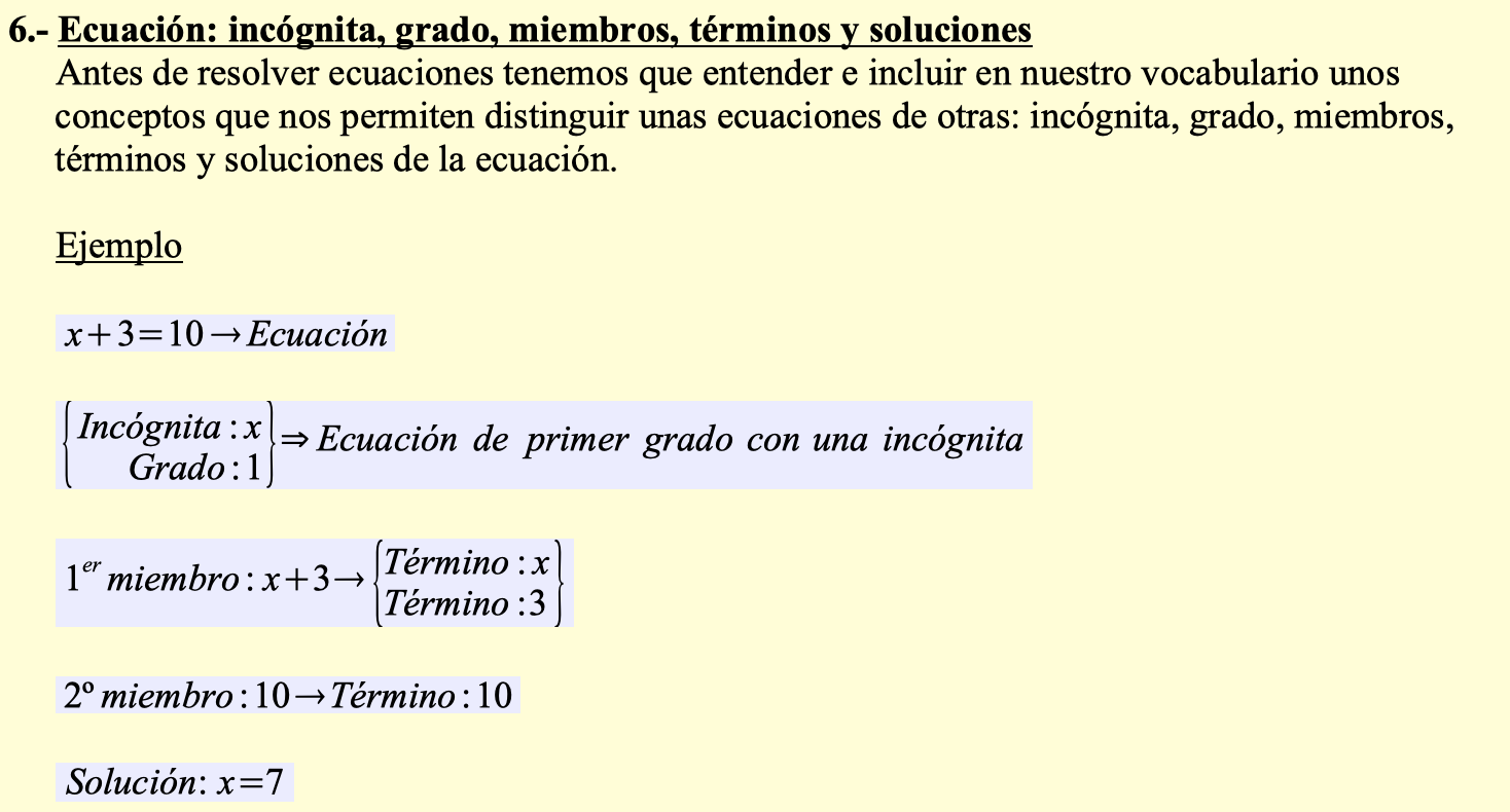 Continuamos con la pregunta 6.- Ecuación: incógnita, grado, miembros, términos y soluciones de la Unidad didáctica 6: Ecuaciones. Sigue las instrucciones y construye los contenidos en tu cuaderno de trabajo.