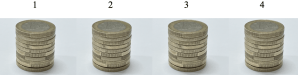 Uno de los montones está formado por monedas falsas. La masa diferencia las monedas verdaderas de las monedas falsas: una moneda verdadera tiene una masa de 10 g y una moneda falsa tiene una masa de 11 g.